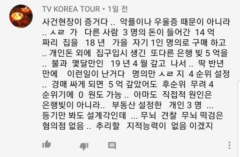 안 그래도 우울증 있는데다 “개인적인 일” 이 최근 겹쳐서 극대화된 것 같은데 그 개인적인 일은 우리는 모르는 거지 부동산이 아닐까 하는 것도 사실 추측에 불과하고