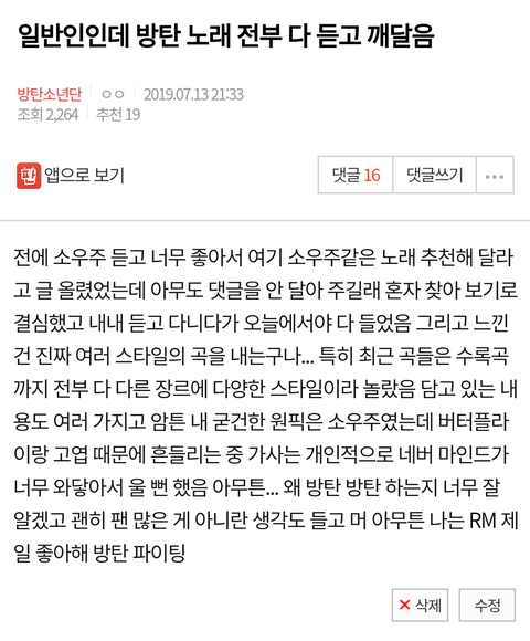 사실 이 글이 팬들한테 어떻게 전해질지 모르겠어서 내내 망설였는데 그래도 드는 생각이 많아서 한 번쯤은 정리해 보고 싶었어 방탄 진짜 멋있다 여전히 응원하고 있어 음원 사이트나 사클에도 없어서 내가 놓친 방탄 노래가 있다면 꼭 좀 알려주라 어째 파헤치면 파헤칠수록 명곡이 많네 그리고... 사클 노래 다운 받는 법이 있다면 공유 좀 해 줘 네 시는 죽어도 플레이리스트에 추가 해야겠어
