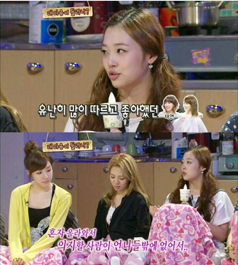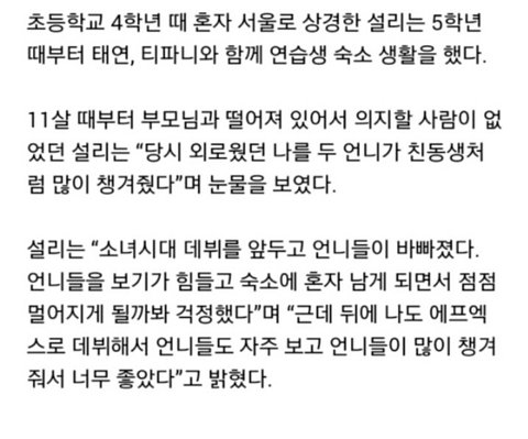 너무나도 이른 나이에 집과 떨어져 독립하게 된 아이들이 함께 의지하고 서로를 보살피며 미래가 확실치 않은 연습생 기간을 보낸건데 설리는 당시 16세였던 티파니 태연보다 다섯살이 더 어렸다는거