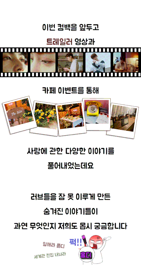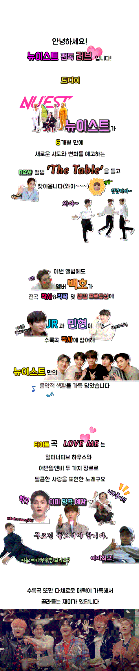 안녕하세요. 뉴이스트 팬톡 러브입니다. 6개월 만에 돌아오는 다섯 남자를 위해 영업글을 준비하면서 지난 앨범 'Happliy ever after'의 수록곡들로 가사짤을 만들었습니다. 마음껏 구경하고 가세요. 다른 분들의 감상을 위해 대댓은 자제해 주시면 감사하겠습니다. 10월 21일 오후 6시에 공개되는 7번째 미니 앨범 'The Table' 많이 많이 기대해 주세요. 'LOVE ME' 들어주시는 모든 분들 LOVE YOU~♡