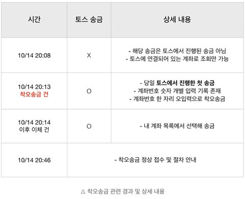 - 10월 14일 20시 13분 이전의 송금건은 계좌연결을 통해 조회되는 내역일 뿐 토스 앱을 통해 송금된 건이 아님