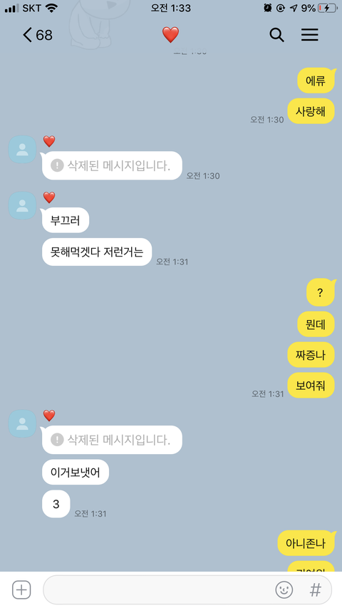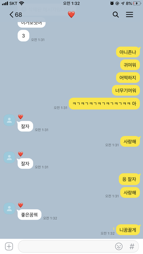 사랑해 하니까 너무 좋아 이모티콘 기여운거 보내고 삭제하길래 머냐니까 저러는데 넘 기여움 ㅋㅋㅋㅋㅋㅋㅋ 아 ㅠ ㅎ 부끄러워하는거넘기엽지안냐
