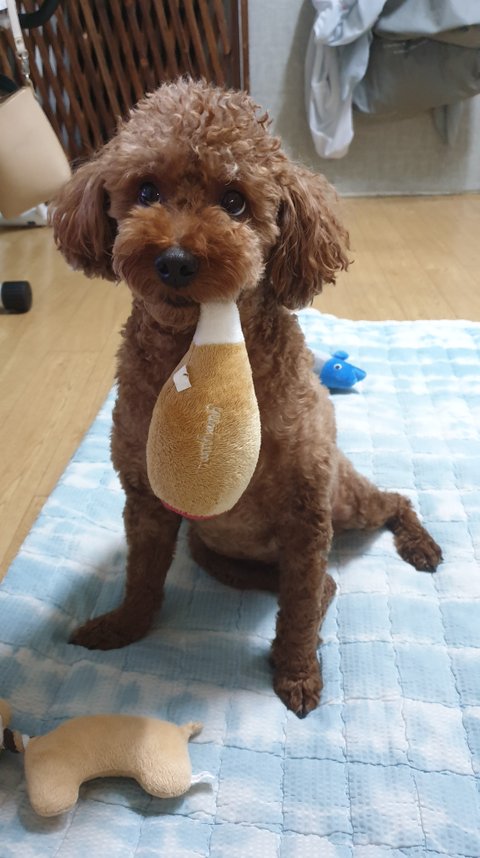 좋아하는 장난감 가지고 놀다가 입에 물고있는데