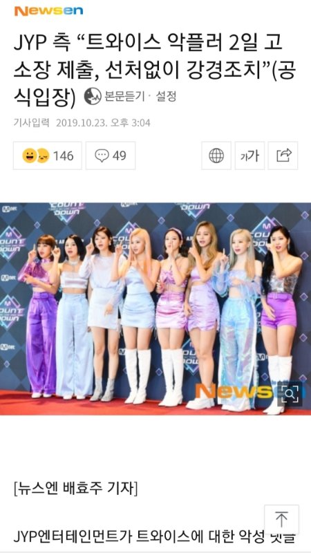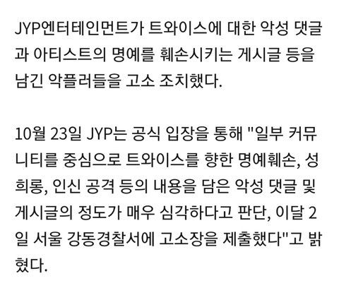 악플러 고소장 접수했대 추가 고소도 예정중 역시 제왑 고소 꾸준히 해 피뎁딴 보람이 있네 판에 있는 트와팬들아 악착같이 피뎁 다 따서 꼭 고소시키자!
