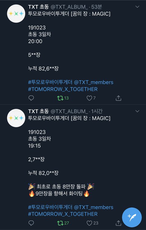모아들아 초동 기록 수시로 확인하고 싶으면 짹 @TXT_ALBUM_ 여기서 확인해봐!! 개인적으로 나는 저 초동 기록계에 올라오는 트윗들을 보면서 엄청난 뿌듯함을 느껴,,,