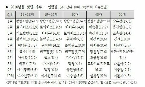 갤럽도 똑같아 10~40대까지 든 가수 방탄 트와 아이유 셋뿐, 50대까지 전 연령든건 방탄뿐 ㅊㅋㅊㅋ