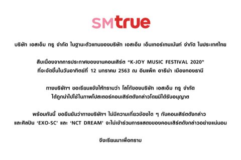K-JOY music festival used SM True logo without permission and also announced that EXO-SC and NCT DREAM will attend, which is fake. Both groups won't attend in the first place, not cancel or anything.