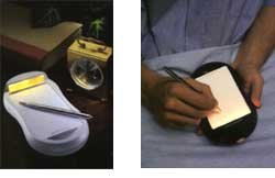 나이트 노트 노트패드(nite note notepad) 잠자리에 들기전 갑자기 떠오른 할일이나 생각을 옆에서 자고 있는 사람을 방해하지 않고 기록할 수 있는 메모 패드입니다. 미국의 우주비행사들이 사용하는 어떤 각도에서든 심지어는 거꾸로 누워서도 글이 써지는 피셔 스페이스 펜(fisher space pen)이 딸려 있습니다. 펜을 꺼내 집으면 메모 패드에 불이 켜지고 펜을 제자리에 놓으면 불이 꺼집니다.