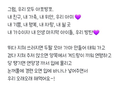 뭔가 방송물 드신 분이라 그런지 주접이 깔끔해 이렇게 군더더기 없이 담백한 주접은 처음이얔ㅋㅋㅋㅋㅋㅋㅋㅋㅋㅋ 길어도 술술 읽히고 재밌는데 감동도 있고 필력 최고시다 진짜ㅋㅋㅋ 앞으로 어디서든 수록곡이 들리면 저팀에도 있구나 아미 하면서 봐야게써 아포방포 우리 오래오래 해먹자 이삐들