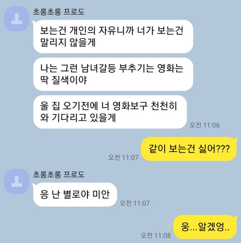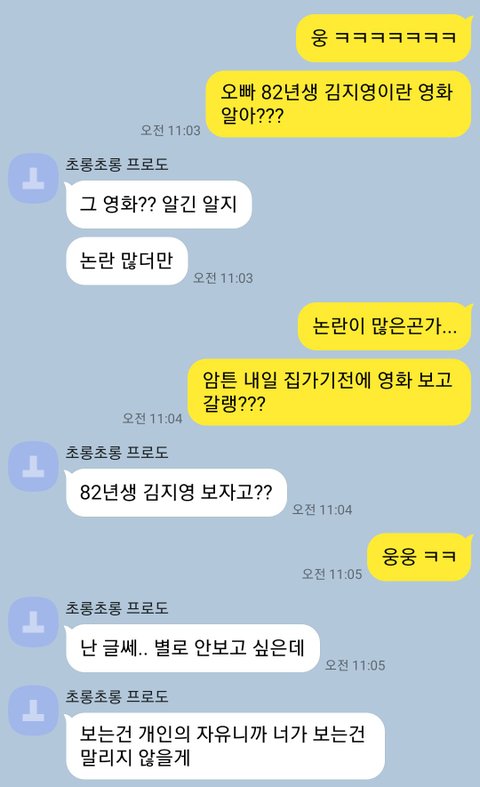 82년생 김지영 영화 안본다고 한남이라고 하는 행동 자체가 모순.. 그러지들 맙시다 저도 개봉하고 보러갔었는데 그냥 그럴수도 있겠다 이정도로 생각했는데 영화 자체가 자극적인 부분이 많아서 영화 끝나고 논란이 될만한 영화임에는 분명하다고 생각했거든요