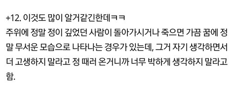 주위에 정말 정이 깊었던 사람이 돌아가시거나 죽으면 가끔 꿈에 정말 무서운 모습으로 나타나는 경우가 있는대, 그거 자기 생각하면서 더 고생하지 말라고 정 때러 온거니까 너무 박하게 생각하지 말라고 함.