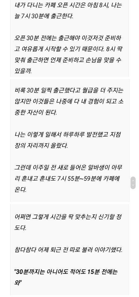 저도 지금 알바쓰는 업주입니다. 제가 알바한테 잘지키라는게 시간입니다. 근데 전 알바한테 무조건 15분 일찍 오라는 이야기 절대 안합니다. 자기 시간만 잘 지키라고... 솔직히 알바들 많이 써봤지만 주인의식을 가지고 열심히 하는 애들은 드뭅니다. 대부분 자기시간만 일하면서 적당히 시간 때우고 열심히 하지 않으면서 최저시급에 주휴수당 받으려고 혈안이 되어있고 나갈때되면 한푼이라도 더 뜯어낼려고 얼굴에 철판깔고 근로기준법 들먹이면서 노동청이 신고하니 하는 알바들 많은데 전부다 보면 근로기준법 하나도 모르고 되도안한것만 요구하는것들 천지입니다. 알바들 그렇게 출근 15분전에 와서 일하라고 하면 전부다 안할려고 합니다. 막말로 초과근무 수당 주는거 아니잖아요. 업주 입장에서는 당연하다고 생각하겠지만 알바들은 생각이 다릅니다. 그렇게 초과근무를 하면 그만큼 시급을 더 달라고 하겠죠. 일바한테 그런거 요구하지 말고 시간 잘지키면서 일 열심히 하면 그걸로 족해야 합니다. 본인이 그렇게 해서 지점장 자리에 올랐다고 해서 알바들도 무조건 그렇게 해야한다는 생각은 버리십시요. 저도 업주지만 알바들도 어떻게 보면 자기집에서는 귀한 자식이고 인격을 가진 인격체입니다.