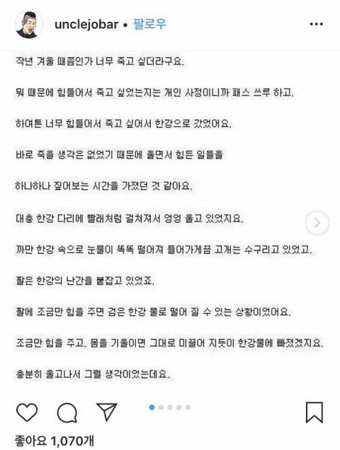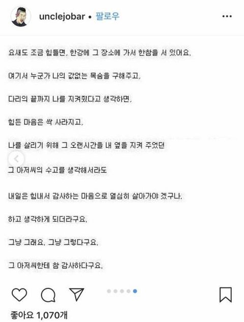 아저씨가 단순히 옆에 서 있었다고 생각하고 그냥 놓치거나 오히려 성가시다구 삐딱하게 생각할 수도 있을 일인데 저렇게 감사할 줄 아는 것만으로도 저 글쓴이 심성이 고운거임 좋은 사람한텐 좋은 사람이 오는 것 같음 저런 사람에게 뭐가 그렇게 힘든 일이 있었을까.. 두 분 다 좋은 일만 있었음 좋겠다
