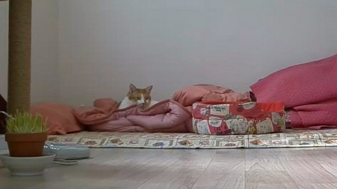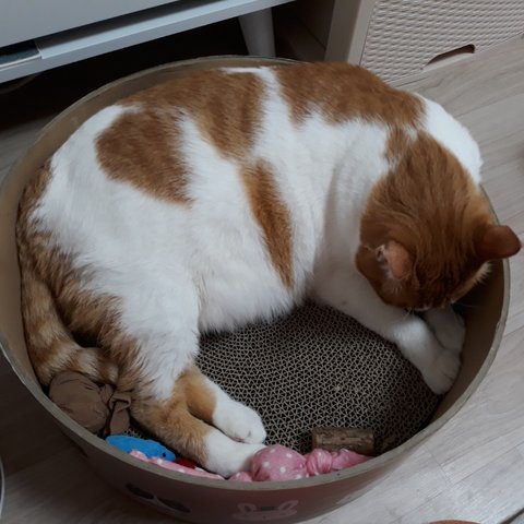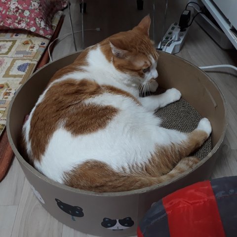 스크래쳐 위치를 옮겼더니 안에 들어가서 놀고 있음.