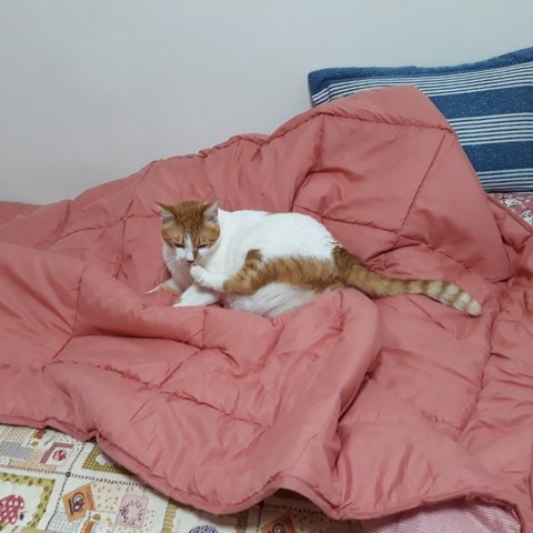 새이불 감촉이 좋은지 이불위에서 다리 목욕함.