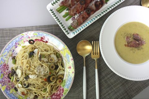 아스파라거스스프, 베이컨말이, 오일파스타