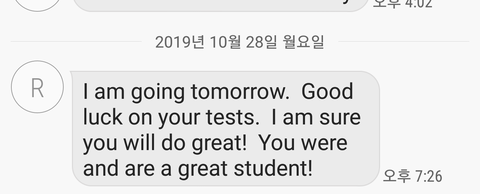 초딩 때 방과후 가르치신 원어민 선생님인데 이 쌤이 나 지금 고삼인데 오랜만에 연락해서 연락 주고 받다가 만나자고 했다가 내가 부담스러워서 수능핑계대고 거절했단말임 그이후로 저쌤이 I'm so sorry 이래서 개부담이어서 걍 씹고 있다가 내일 한국 뜬다고 저렇게 응원문자 왔는데 답장 추천좀 해줘 너무 친밀함이 묻어나지 않으면서 그래도 따뜻한...ㅠㅠ 추천햐죠