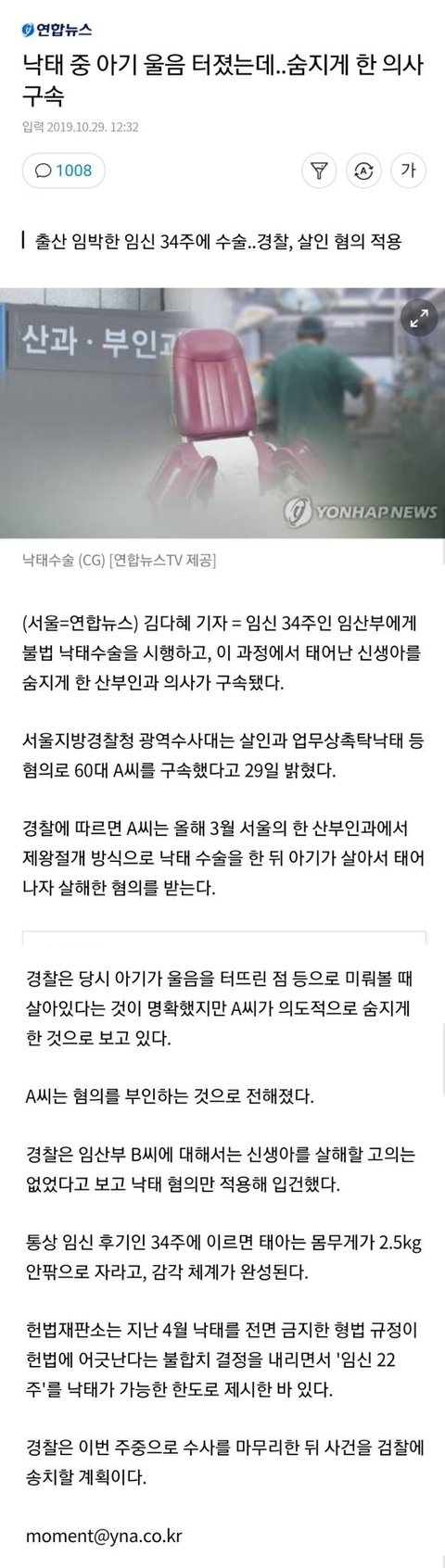 그러니까 34주된 임산부가 불법 낙태수술을 의뢰를 했고. 그 낙태 수술 중에 아기가 살아서 나오니까 의사가 죽였다는 거네. 미친년과 살인마의 환상의 콜라보레이션이네.