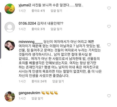 이거 한남들이 흔히 말하는 김치녀 된장녀 아님? ㅋㅋㅋ 저렇게 남자한테 의지하면서 대접받길 원하는 여자 싸잡아서 만든 단어 였잖아 ㅋㅋㅋㅋㅋㅋㅋㅋㅋㅋㅋㅋㅋㅋㅋㅋㅋㅋㅋㅋ 본인들이 싸잡아서 욕한 여자를 찬양하는 꼴이네 ㅋㅋㅋ