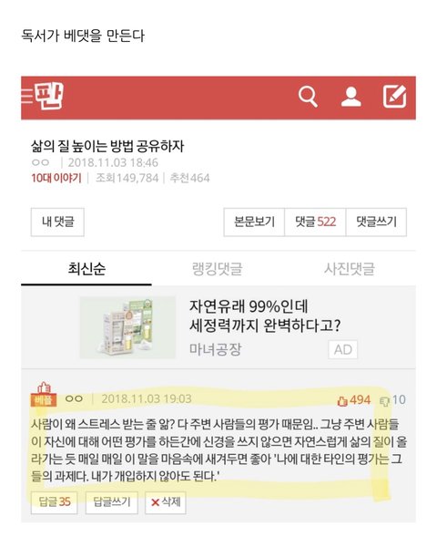 베댓된거 캡쳐해놨길래 아직도 그 글 있나 찾아봤다ㅋㅋㅋㅋㅋㅋㅋㅋㅋㅋㅋㅋ 진짜 미움받을 용기는 내 인생책ㅠㅠ