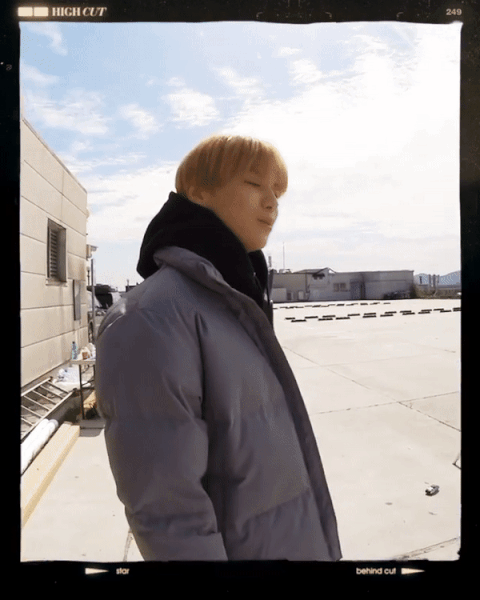 햇살에 강다니엘의 싱그러움에 눈부셨던 하이컷 화보 현장. 스케이트보드 하나로 촬영지인 주차장을 유영하듯 누비고, 셀프캠을 찍는 녤모예드적 순간!