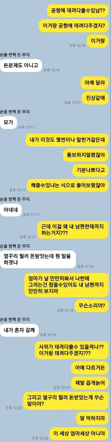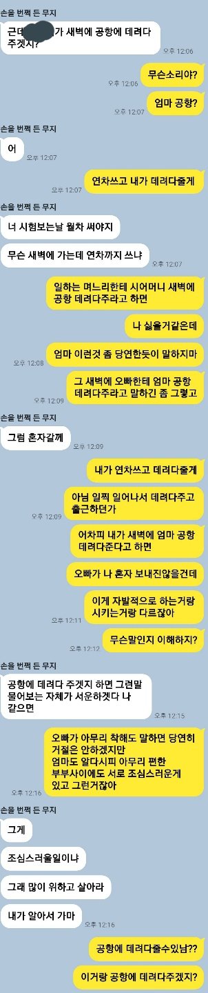 그래서 저희집이 인천 송도라 공항이랑 가깝고 또 오빠 직업이 출근이 유동적이고 좀 자유로운 직업이라 안일한 생각으로 데려다줄수있겠지? 라고 생각하신거 같아요. 엄마가 차로 저희집까지 오고, 저희는 공항까지 데려다주는? 그리고 애교섞인 말이였다고 하시더라구요.