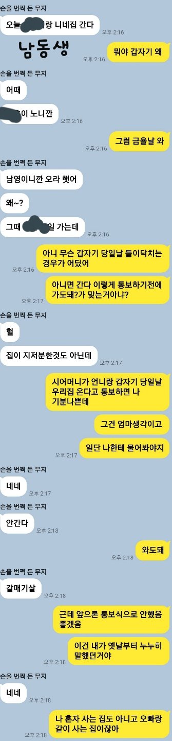 결혼전에 술자리도 몇번 있었고 가족들 다같이 만나는 자리에 어색하면 제 남동생이 분위기 메이커? 같은 역할이라 오빠가 제 남동생 편하게 생각하고 귀여워해주고 남동생도 제 남편한테 예의갖추고 잘 따르구요~ 근데 남동생은 따로 나가살고 주말에도 일했었기 때문에 저 결혼하고나서 신혼집에 올 시간이 없었어요. 그래서 엄마가 그런방식으로 통보한건 기분나쁘지만 그래도 동생 시간날때 오랜만에 만나서 다같이 저녁시간 보내고싶은 마음에 '와도돼' 한거예요..다음부턴 통보식으로 안하겠지 하는 마음으로요...