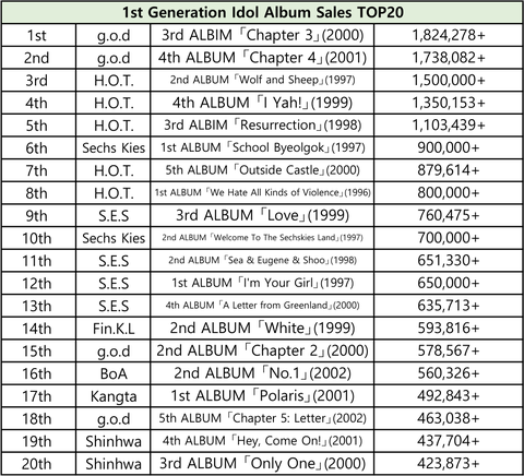 1위 g.o.d 정규 3집 182만장(대표곡 거짓말, 촛불하나)