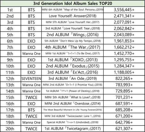 3위 방탄소년단 미니앨범 5집 207만장(대표곡 DNA)