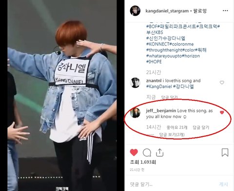 https://www.instagram.com/tv/B4OuG6VFbSa/ 녜리인별은 아니고 kangdaniel_stargram에 올라온 파크콘 I HOPE 리허설 영상에 댓글 남김
