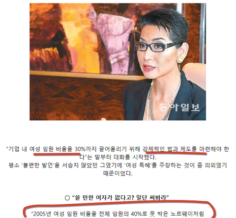 오히려 김성주 사장은 여성할당제와 여성임원을 써야한다며 주장함.