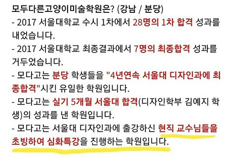 1. 서울대 미대 디자인학부 실기 1차 합격 인원 100여명 중 50명이 같은 학원에서 배출