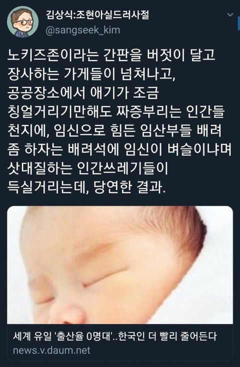 애초에 공공장소에서 애기 컨트롤 못하고 다치면 남탓하고 카페에 기저귀 버리고가는등 몰상식한 사람들이 많아지니까 저런게 생기는거 아닌가? 근데 뭐가 잘못됬는지 모르고 당당한게 대부분ㅋㅋㅋ 결국 그런사람들 때문에 잘하는사람까지 싸잡아서 피해보는거지