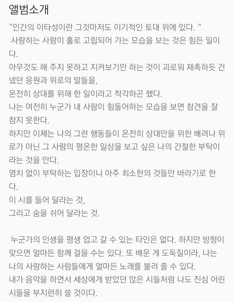앨범일정을 연기하고 수록곡만 오늘 선공개된건데 그거랑 같이 나온 이번 5집 앨범 소개글이 ㄹㅇ개슬프고 위로돼서 보는 사람마다 반응 오짐ㅠㅠㅠ 글 진짜 너무 와닿는다 노래 가사랑 같이 보면 더 좋음ㅇㅇ