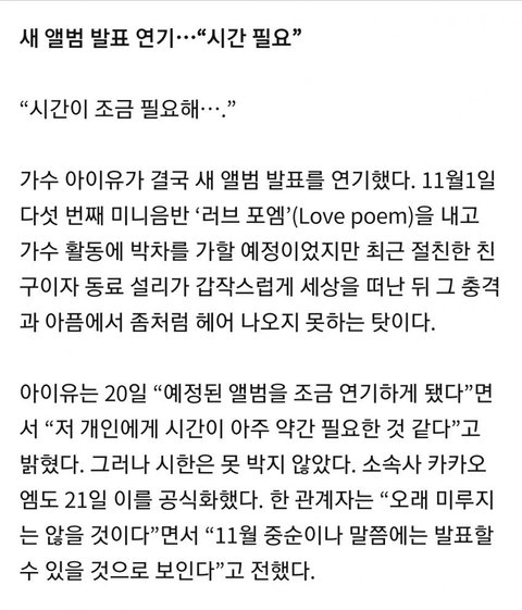 아이유 앨범 연기 11월중순에서 말에 발표~