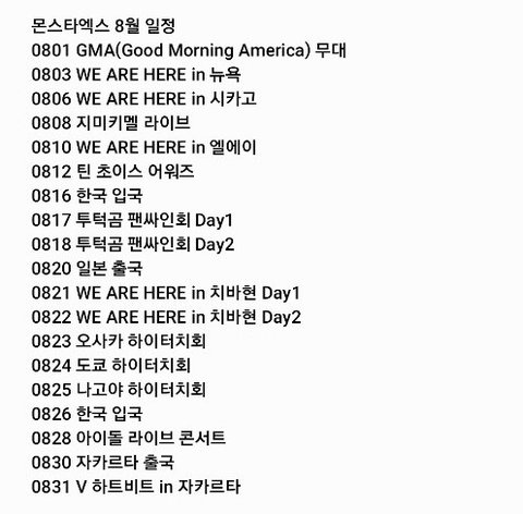 이게 뭐냐면 몬스타엑스 8월 일정이야.