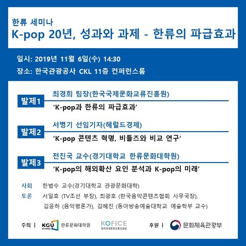 누구도 예상치 못했을 만큼 큰 성장을 이룬 K-POP 시장과 한류열풍에 관한 내용을 다루는 세미나인데요!
