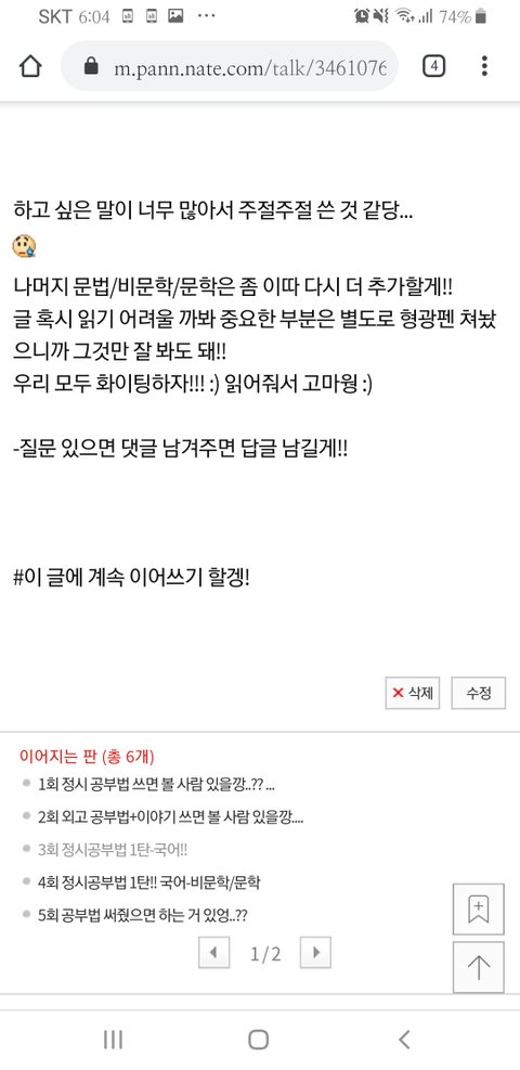 예비 고1한테 유대종 추천한 건 미안ㅠㅠㅠ 베댓 있는 김에 말한당.. 어제 새벽에 비몽사몽하게 댓글 달다가 다 고3 기준으로 댓글 달아줬던 것 같아ㅠㅠ
