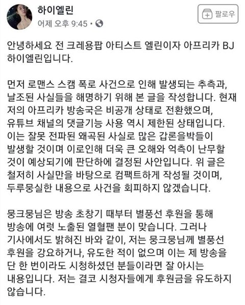 크레용팝 출신 BJ엘린 해명문