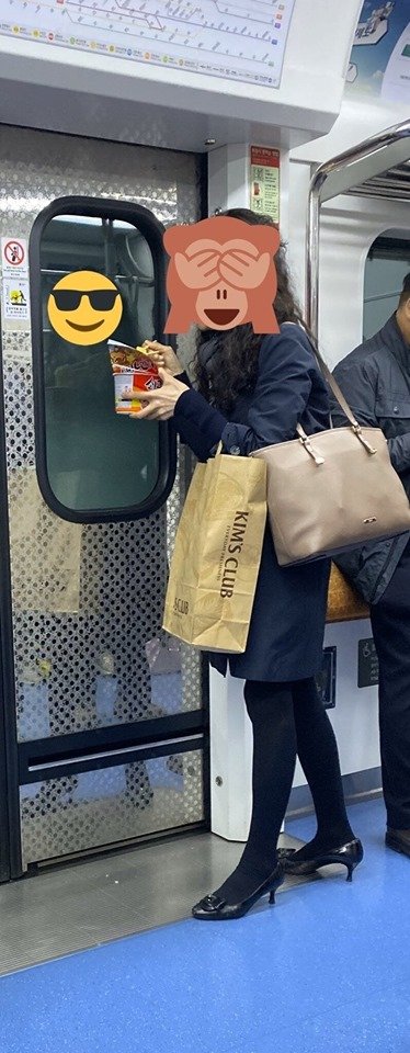내생각엔 저 사람 한국인 아닐거같은데...중국에선 걸어다니면서 빵이나 버거 먹는 수준이 아니라 걸어다니면서 저렇게 국물있는 면발 먹던데....한국인은 눈치보는 민족이라 저렇게 대놓고 전철안에서 먹을 일이 희박할텐데..