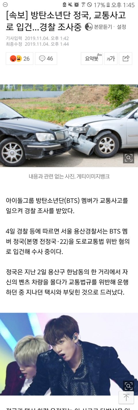 정국이 부주의했던건 맞는데 뭔 음주나 무면허도 아니고 기사를 왜케 자극적으로 뽑아ㅋㅋㅋ 벌써부터 장용준보다 욕 ㅈㄴ처먹을 생각에 진절머리난다