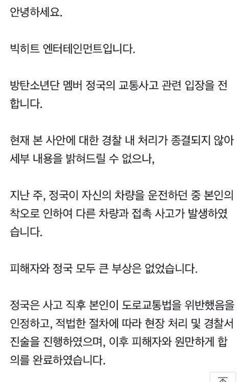 도로교통법위반이라잖아. 무슨 운전자들이 평소 한번씩은 다 위반해서 사고내는것처럼 쉴드치는 아미들 진짜 정신차리길.교통법위반자체가 사고랑 직결되는거야. 하다못해 불법주정차를 코너부근에 하게되면 접촉사고유발하는거임.아니 본인이 잘못하고 인정한걸 왜 팬들이 나서서 쉴드쳐서 더 욕먹게만드냐 ㅉㅉ 무슨 누구나 교통사고 한번씩는 내는마냥 글싸지르네