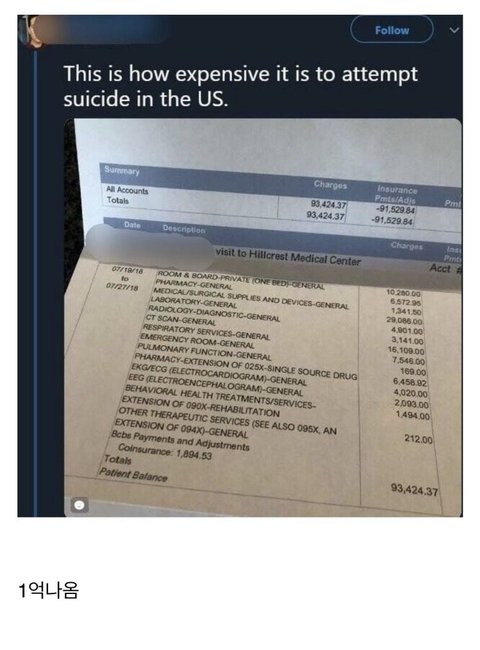 맨위에 -91,529 써있잖아. insurance면 보험인데 보험사에서 저만큼 부담해 준다는거 아냐? 그럼 1900달러만 내면 되는데... 뭐 200만원도 싼돈은 아닌데 방사선 포함 여러가지 검사에 1인실 쓴것치고 아주 비싼돈은 아니지 않아?