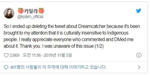 카일라는 그룹명 '드림캐쳐'가 인종차별적이라고 지적했다. 각종 앨범 콘셉트와 뮤직비디오 등에서 원주민 토착 문화를 비하했다는 것이다.