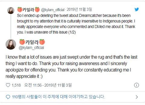 카일라는 사태 수습에 나섰다. 그는 "내가 올린 트윗이 '드림캐쳐'를 공격하는 건지 몰랐다"고 해명한 후 이전에 올린 트윗들을 모두 삭제했다.