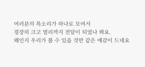 "사실 공백기동안 빅톤과 앨리스라는 이름을 내려놔야 하는 시기가 오고 있었어요. 빅톤이라는 존재가 갑자기 먼지처럼 사라지게 되면.. 우리는 괜찮아도... 팬분들은 우릴 걱정할거 같은거에요. 우린 그게 걱정이돼서 준비하던 곡이였어요. 이걸 앨리스에게 꼭 들려주고 싶었는데.. 전 오늘 이걸 들려줘서 한이 없어요"