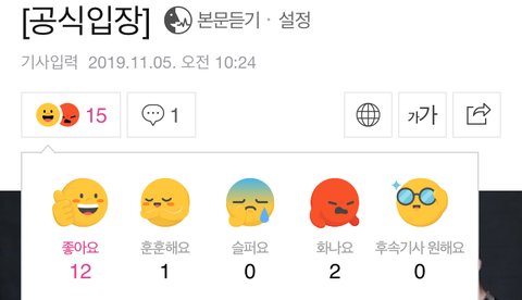 화나요 누르러 악플러들 우르르올때 말야.. 좋아요는 보통 팬들이 많이 눌러서 압도적인데, 일반적으로 훈훈해요는 잘 없거든 근데 좋아요가 아무리 많아도 화나요보다 훈훈해요가 비율이 더 높아야 이모지 얼굴이 둘다 착하게 바뀌어. 빨간 화나요보다 노랑 귀여미들이 더 많았으면 좋겠어서~화나요가 많이 보이면 훈훈해요도 눌러주길~ 우리 애들도 기사볼건데 노랑이 많이 보였으면 좋겠어서 적어봐써