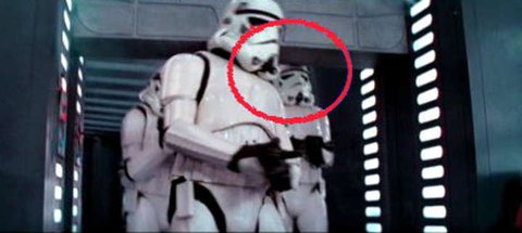 <스타워즈 에피소드 4 : 새로운 희망>에서 스톰크루퍼 부대가 자주 움직이는 장면이 그 대표적인 장면인데, 그로 인해 앞이 보이지 않는 헬멧으로 인해 천장에 부딪힌 스톰 크루퍼의 NG장면이 그대로 노출됐다.