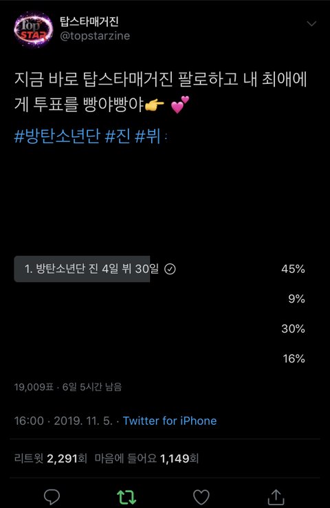 https://twitter.com/topstarzine/status/1191611124078088192?s=21 움직일때가 되어써 계정들 돌리고 오쟈