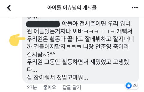 ㅋㅋ워너블한테 화력으로 처발렸던 그룹 팬들 여기 몇있는 것 같은데 익명인데도 다 보이는 건 니네가 그만큼 수준이하라는 거 아닐까? 여기 댓글 달애들이 주작돌 팬덤이랑 멤버 배척하는 팬덤 밖에 더 있나?ㅋㅋ